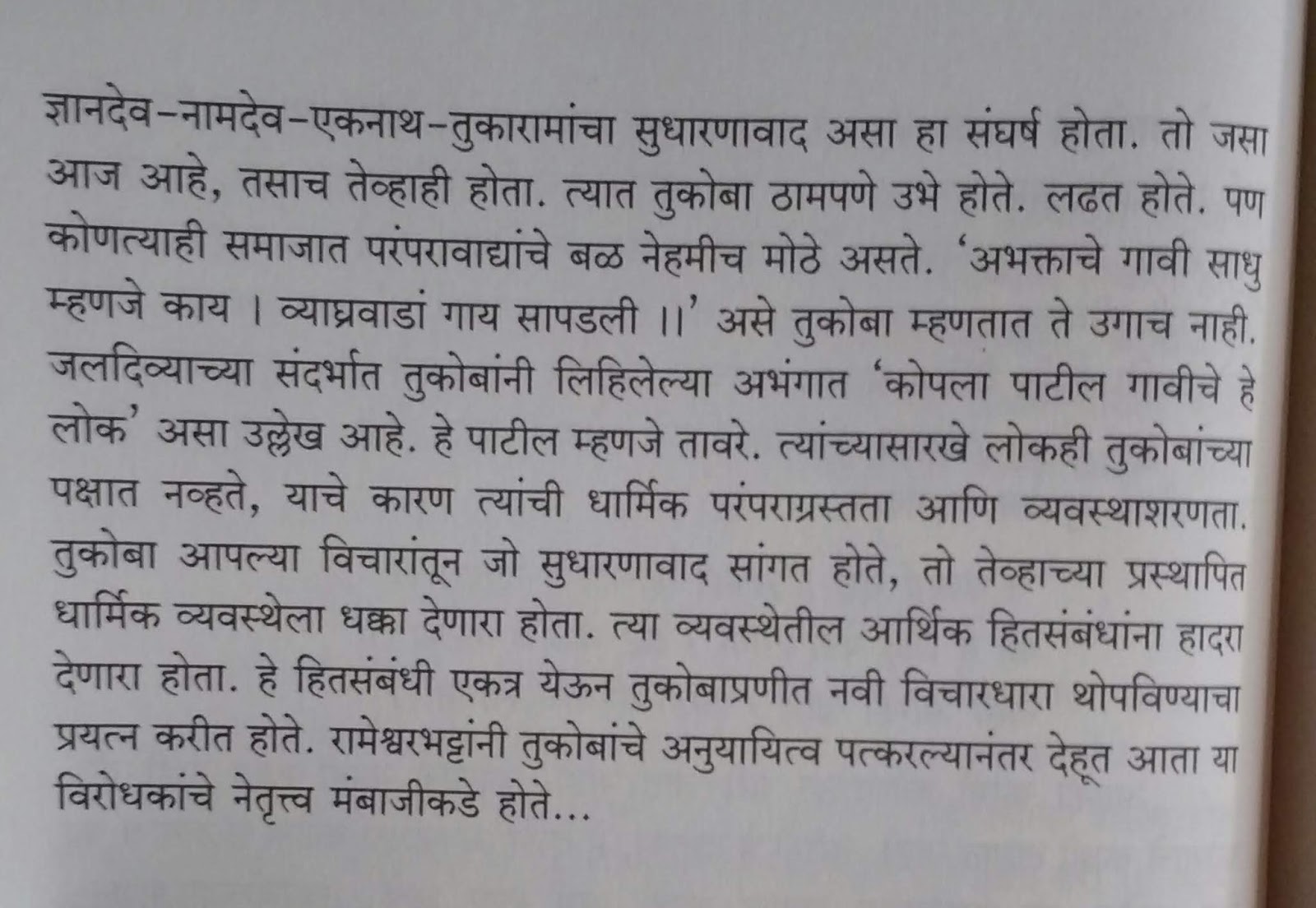 तुकारामांवरच्या लेखात त्यांचे चरित्र मांडले आहे. त्यांच्या वेळची सामाजिक स्थिती, मुसलमानी आक्रमणाचा वरवंटा, जातिभेदात दुभंगलेला आणि कर्मकांडात गुरफटलेला समाज कसा होता याचे वर्णन आहे. या परिस्थितीला धक्का देण्याचे काम, समाजप्रबोधनाचं काम त्यांनी कसं केलं हे विशद केलं आहे. त्यावेळच्या सनातन्यांनी आणि इतर जातीतल्या धर्माभिमान्यांनी त्यांना त्रास दिला त्याचे ऊहापोह आहे. “गाथा तरल्या” आणि “सदेह वैकुंठगमन” हे तुकारामांबद्दलचे दोन प्रसिद्ध चमत्कार. ते चमत्कार का भाकडकथा ? याची चर्चा आहे. बऱ्याच लेखांत इतर संशोधकांची मते, अस्सल कागदपत्रे काय म्हणतात, तत्कालीन संत उदा. बहिणाबाई, त्यांचे बंधू कान्होबा हे आपल्या अभंगातून त्या त्या प्रसंगांचे वर्णन कसे करतात या आधारे तर्कशुद्ध मांडणी करायचा प्रयत्न केला आहे. तुकारामांची रूढ प्रतिमा म्हणजे भोळसट, व्यवहारात कच्चा, देवभक्त वाणी अशी असते. प्रत्यक्षात ते प्रपंचदक्ष होते आणि परिस्थिती विरुद्ध बंडखोरी करणारे कसे होते हे या उदाहरणांतून मांडायचा प्रयत्न केला आहे.