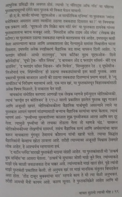 असं माहितीने भरलेलं पुस्तक आहे हे. पुस्तक वाचताना एक मनात आलं की इतकं अफाट वाचन, विषयांच्या खोलात जाऊन अभ्यास करण्याची चिकाटी, विषयाचा सर्व बाजूने पूर्वग्रह न ठेवता अभ्यास करण्याची बौद्धिक तयारी,वैज्ञानिक दृष्टिकोन, विज्ञानाची आवड आणि स्वतःच्या भाषेत ते मांडायची प्रतिभा हे एखाद्या संशोधकाला आवश्यक गुण घाटे यांच्यात ठासून भरले असून स्वतः ख्यातकीर्त शास्त्रज्ञ, संशोधक झाले नाहीत. इतरांच्या अभ्यासाचा, लेखनाचा अभ्यास करून त्यावर आधारित स्वतःचं लेखन त्यांनी केलं, इंग्रजीतली माहिती मराठी लोकांसमोर आणली. हे काम खूपच महत्त्वाचं आहे हे नि:संशय. पण अजून मोठं अद्वितीय काम हातून होऊ शकलं असतं. अशी कल्पना करा की एखाद्या व्यक्तीला उपजत सुंदर गळा आहे. त्याने रियाझ करून फक्त आपल्या गाण्यावर लक्ष केंद्रित करून मोठं गायक होण्याच्या ऐवजी इतरांच्या मैफिली ऐकत, मोठ्या गायकापासून हौशी कालाकारपर्यन्त नुसती गाणीच ऐकत सुटावं, त्यांची वर्णनं करावीत, ते कसे गायले हे आपल्या आवाजात ऐकून दाखवावं. आणि एका महान कलाकाराला समाज मुकावा. तसंच काहीसं वाटलं हे.