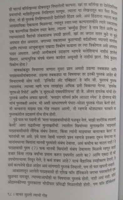 त्यांनी आपल्याला कितितरी पुस्तकांची नावं सांगितली आहेत, ओळख करून दिली आहे. पण ती पुस्तक परीक्षणे नाहीत आणि नुसती अकारविल्हे यादी नाही. तर त्या त्या विषयांवरच्या पुस्तकांवरच्या गप्पा आहेत. वाचनाची सुरुवात कशी झाली, लहानपणी कुठली पुस्तकं वाचायला मिळाली हे सांगितलं आहे. प्रकरणाशी संबंधित एका पुस्तकाबद्दल सांगायला सुरुवात केली की त्या लेखकाच्या अजून पुस्तकांची नावं येतात. मग त्याचाच समकालीन लेखक कोण होता, त्याची पुस्तकं कुठली ते येतं. या लेखकाच्या विरोधी प्रतिपादन कोणी केलं ते येतं. त्याचवेळी मराठीत यातल्या कुठल्या पुस्तकाचं भाषांतर आलंय का, किंवा त्या पद्धतीने कुणी लिहिलंय का ते येतं. देशी विदेशी पुस्तकांच्या दर्जा बद्दल चर्चा होते. काही विषय परदेशात का आणि कसे लिहिले गेले यांची ते पार्श्वभूमी समजावून सांगतात. गप्पांच्या ओघात त्या त्या लेखकाचे किस्से येतात. ही पुस्तकं घाटे यांना कशी मिळाली याचे किस्से येतात. उदा. काही पुस्तकं त्यांना रद्दीच्या दुकानात किंवा जुन्या पुस्तकांच्या दुकानात योगायोगाने मिळाली. जुनी पुस्तकवाले पण अभ्यासू वाचकांना कशी पुस्तकं आठवणीने मिळवून देत याचे अनुभव त्यांनी सांगितले आहेत. विदेशातून भारतात रद्दी म्हणून, जहाजात तळात भरायचं वजन म्हणून पुस्तकं वापरली जायची आणि बंदरावर रद्दीचा लिलाव व्हायचा त्या सिस्टीम ची माहिती सांगितली आहे. त्यांच्या लिखाणाचे, संपादनाचे ही काही अनुभव सांगितले आहेत. नमुन्यादाखल ही एक दोन पानं वाचा म्हणजे कल्पना येईल.