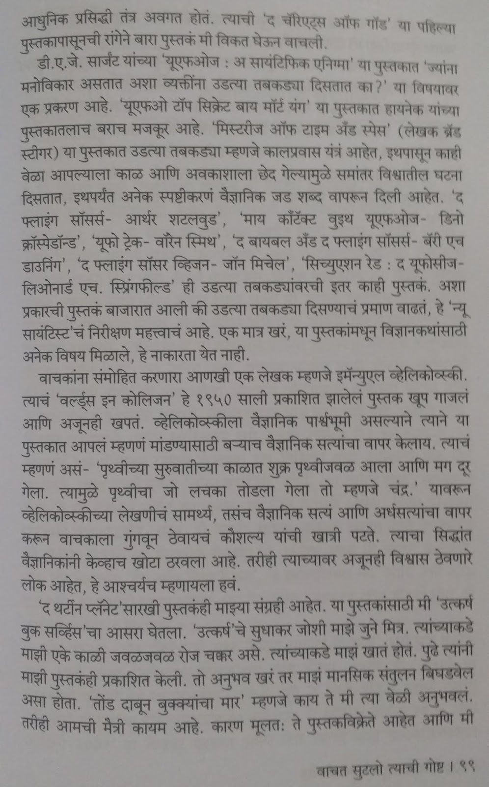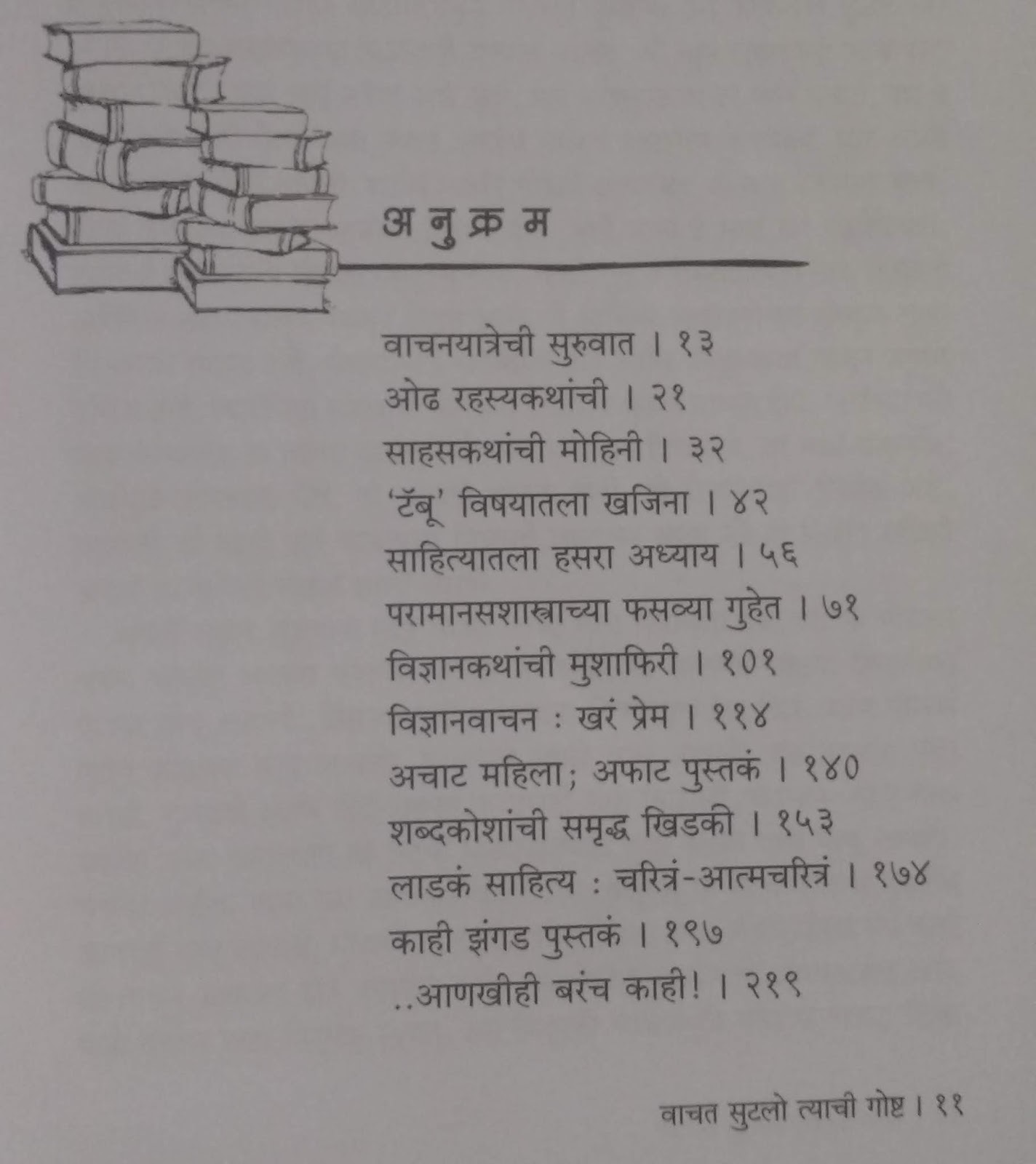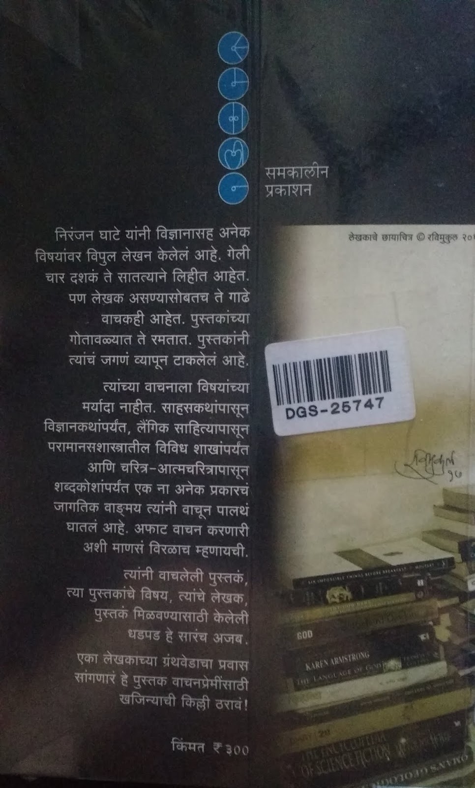 निरंजन घाटे हे प्रसिद्ध विज्ञानकथा आणि वैज्ञानिक लेख लिहिणारे ज्येष्ठ लेखक आहेत. जितकी त्यांची पुस्तकांची संख्या भरपूर आहे (विकीपिडिया नुसार १८५ पेक्षा जास्त) तशीच त्यांची वाचन कारकीर्द ही भरपूर आहे. या पुस्तकातून त्यांनी आत्तापर्यंत वाचलेल्या, महत्त्वाच्या पुस्तकांची लेखकांची ओळख करून दिली आहे. त्यांचं वाचन अफाट आहे. त्यांना कुठला विषय वर्ज्य नाही, लेखक वर्ज्य नाही, लेखन प्रकार वर्ज्य नाही का पुस्तकप्रकार वर्ज्य नाही. कथा, कादंबऱ्या, लेखसंग्रह, चरित्रं हे नेहमीचे प्रकार आहेतच पण संशोधनांचे अहवाल, शब्दकोश, विश्वकोश, विषयानुरूप जंत्र्या, असभ्य/चावट कथा-कविता त्यांनवरची वैज्ञानिक माहिती; भूत-पिशाच्च-प्लॅंचेट यांच्यावरची पुस्तके हे देखील आहे. म्हणूनच त्यांनी विषयानुरूप प्रकरणे ठेवली आहेत ती अशी