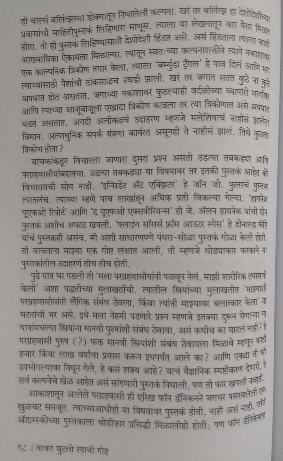 असं माहितीने भरलेलं पुस्तक आहे हे. पुस्तक वाचताना एक मनात आलं की इतकं अफाट वाचन, विषयांच्या खोलात जाऊन अभ्यास करण्याची चिकाटी, विषयाचा सर्व बाजूने पूर्वग्रह न ठेवता अभ्यास करण्याची बौद्धिक तयारी,वैज्ञानिक दृष्टिकोन, विज्ञानाची आवड आणि स्वतःच्या भाषेत ते मांडायची प्रतिभा हे एखाद्या संशोधकाला आवश्यक गुण घाटे यांच्यात ठासून भरले असून स्वतः ख्यातकीर्त शास्त्रज्ञ, संशोधक झाले नाहीत. इतरांच्या अभ्यासाचा, लेखनाचा अभ्यास करून त्यावर आधारित स्वतःचं लेखन त्यांनी केलं, इंग्रजीतली माहिती मराठी लोकांसमोर आणली. हे काम खूपच महत्त्वाचं आहे हे नि:संशय. पण अजून मोठं अद्वितीय काम हातून होऊ शकलं असतं. अशी कल्पना करा की एखाद्या व्यक्तीला उपजत सुंदर गळा आहे. त्याने रियाझ करून फक्त आपल्या गाण्यावर लक्ष केंद्रित करून मोठं गायक होण्याच्या ऐवजी इतरांच्या मैफिली ऐकत, मोठ्या गायकापासून हौशी कालाकारपर्यन्त नुसती गाणीच ऐकत सुटावं, त्यांची वर्णनं करावीत, ते कसे गायले हे आपल्या आवाजात ऐकून दाखवावं. आणि एका महान कलाकाराला समाज मुकावा. तसंच काहीसं वाटलं हे.