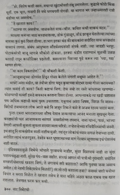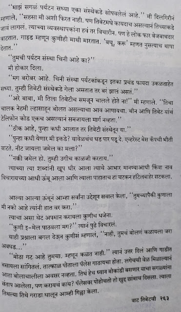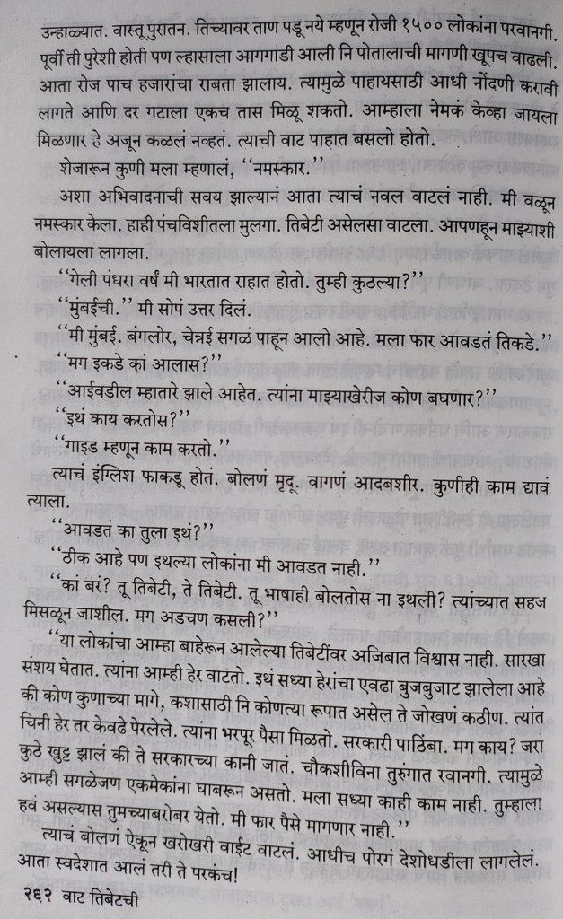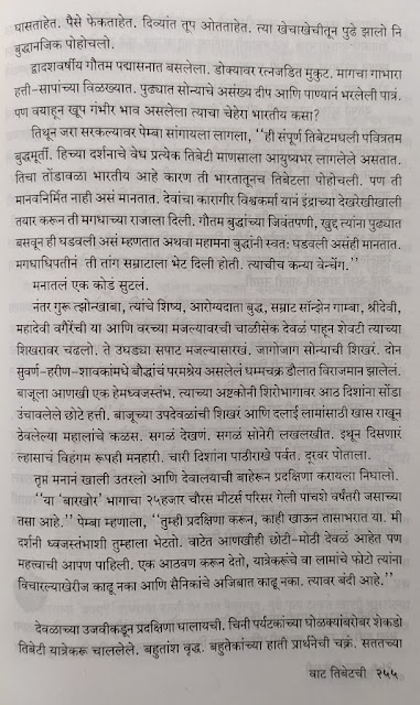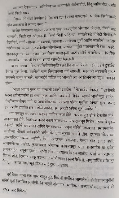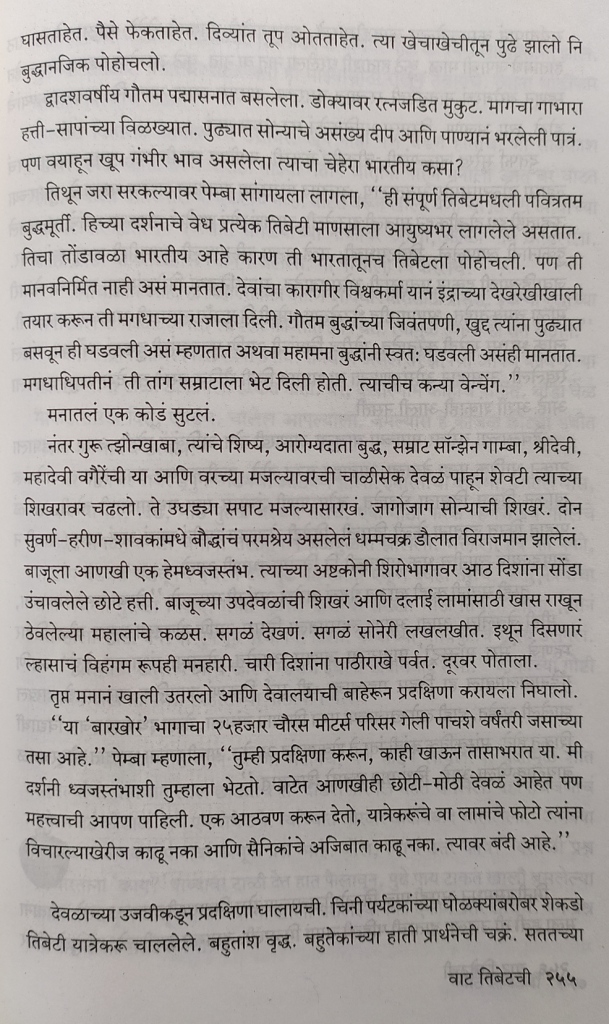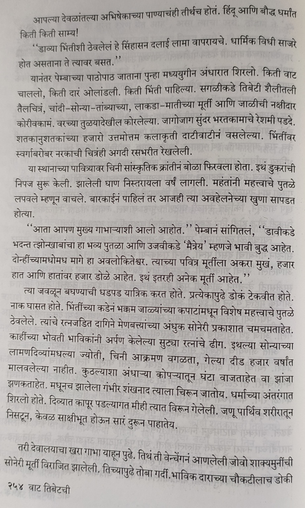 तिबेट मधल्या प्रसिद्ध बौद्ध धार्मिक स्थळांना लेखिकेने भेटी दिल्या. या स्थळांच्या आजूबाजूचा निसर्ग, प्रत्यक्ष वास्तू आणि त्यांचं ऐतिहासिक व सांस्कृतिक महत्त्व लेखिकेने अतिशय रोचक पद्धतीने सांगितले आहे. त्यामुळे तिबेट बद्दल फार काही वाचलं असेल तरी संदर्भ स्पष्ट होतात आणि त्या स्थळांचे महत्त्व आणि रुपडे आपल्या नजरेसमोर उभे राहते. एका मंदिराचं हे वर्णन वाचा.