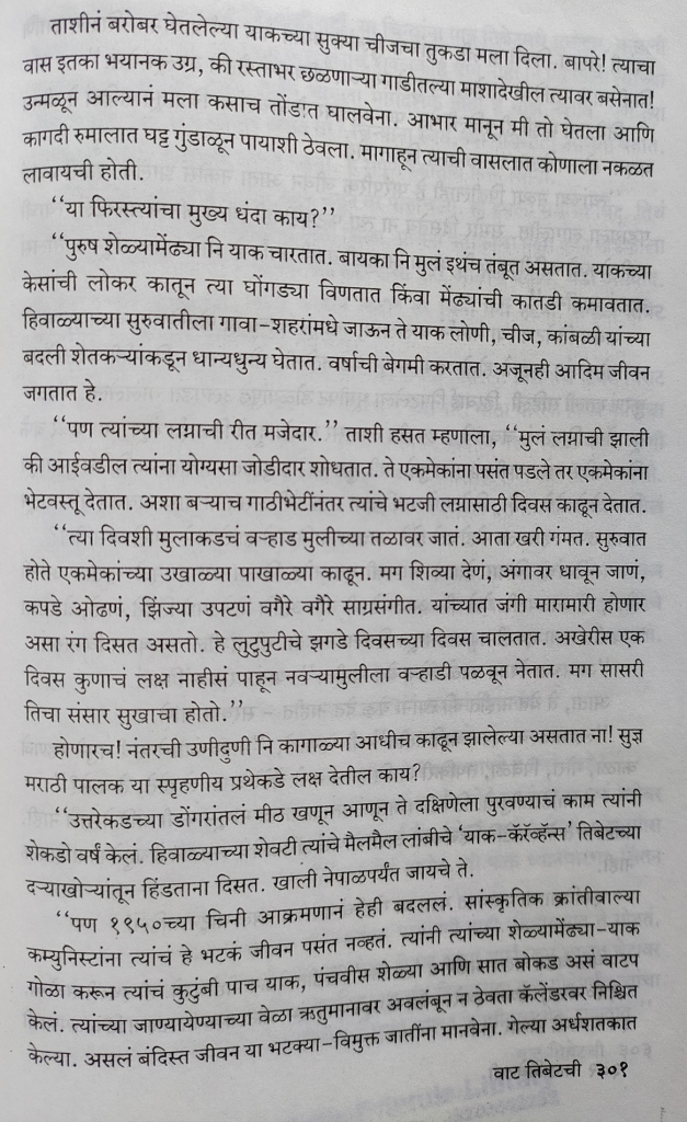तिथल्या लोकांशी, गाईडशी बोलता बोलता तिथली संस्कृती, लोकांची जीवनशैली सुद्धा लेखिका समजून घेत होत्या. माणसांच्या अंत्यसंस्कारांची वेगळीच पद्धत तिकडे आहे. मृतदेहाचे तुकडे करून त्याच्या मासाचे गोळे गिधाडांच्या स्वाधीन करून मरण्याची “स्काय बरीयल” बद्दल पुस्तकात वाचायला मिळेल. तिबेट मधल्या भटक्या जमातीबद्दलची ही काही माहिती.
