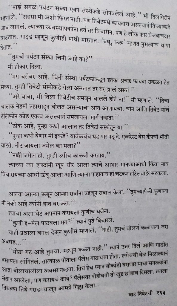 तिबेट मधली चिनी दडपशाही ठायी ठायी दिसतेच. अर्थातच, त्याबद्दल बोलायला लोकांना परवानगी नाहीच. पाठीवर सतत पोलीस नाहीतर चिनी लष्कराची गस्त आणि हेरगिरी यामुळे तोंड दाबून बुक्क्यांचा मार अशी अवस्था. तरीही लेखिकेने जमेल तसं लोकांना बोलतं करायचा प्रयत्न केला. ते अनुभवकण पुस्तकात वाचायला मिळतील.