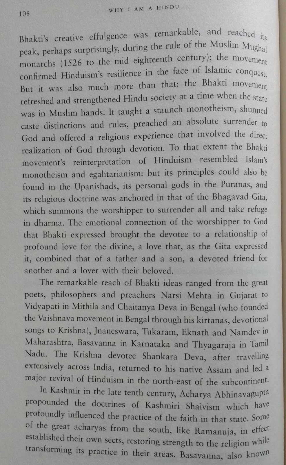 जेव्हा मुसलमानी आक्रमणाच्या वेळी देवळांचा विध्वंसक काही प्रमाणात झाला, खुलेपणाने धर्माचरण करणं कठीण झालं अशावेळी भक्ती संप्रदायाच्या माध्यमातून कर्मकांड विरहित धर्मपद्धती कशी मांडली गेली आणि त्यातून हिंदू धर्म कसा टिकला याचे सुंदर विश्लेषण केलेला आहे.