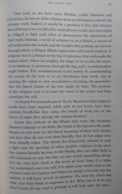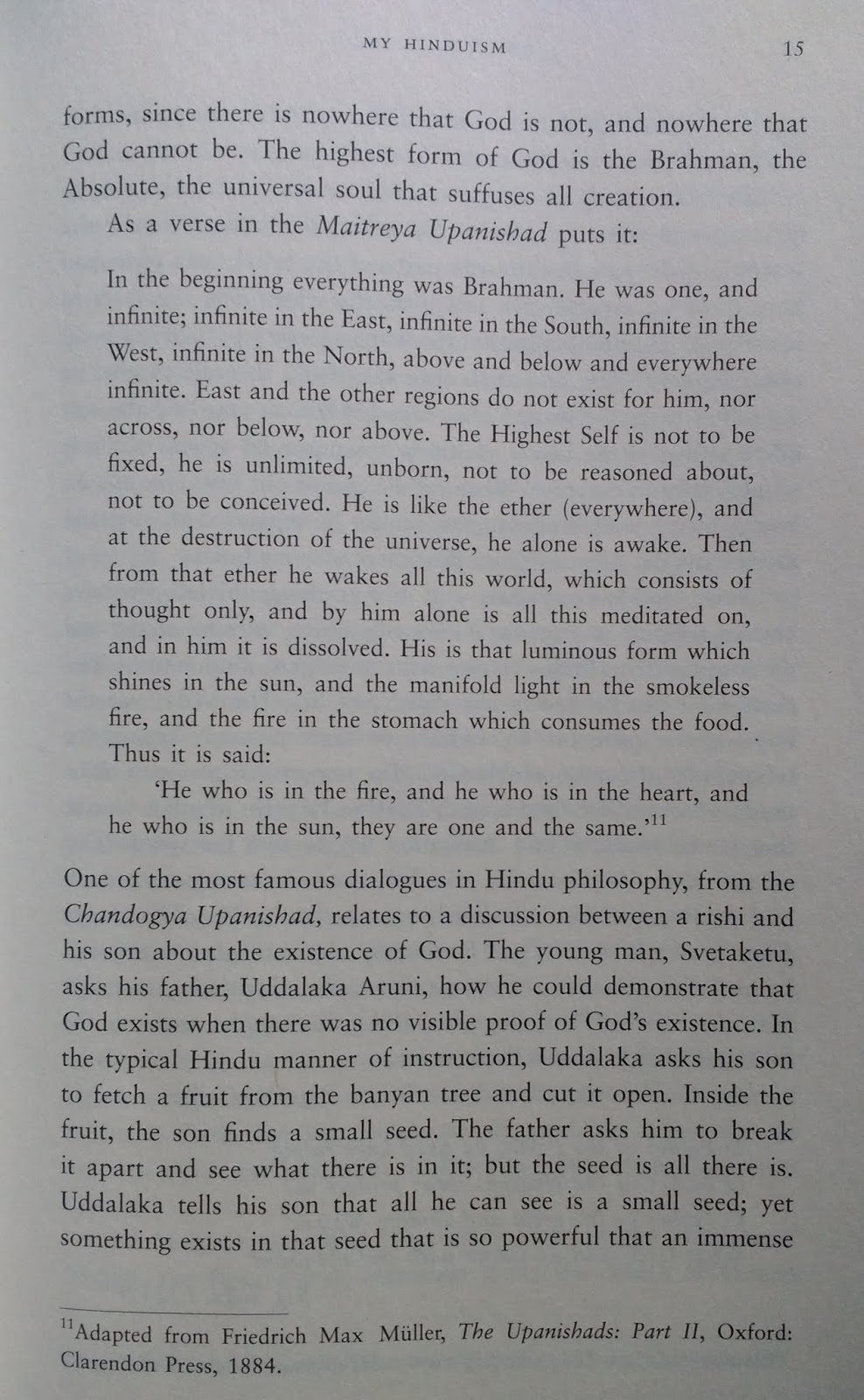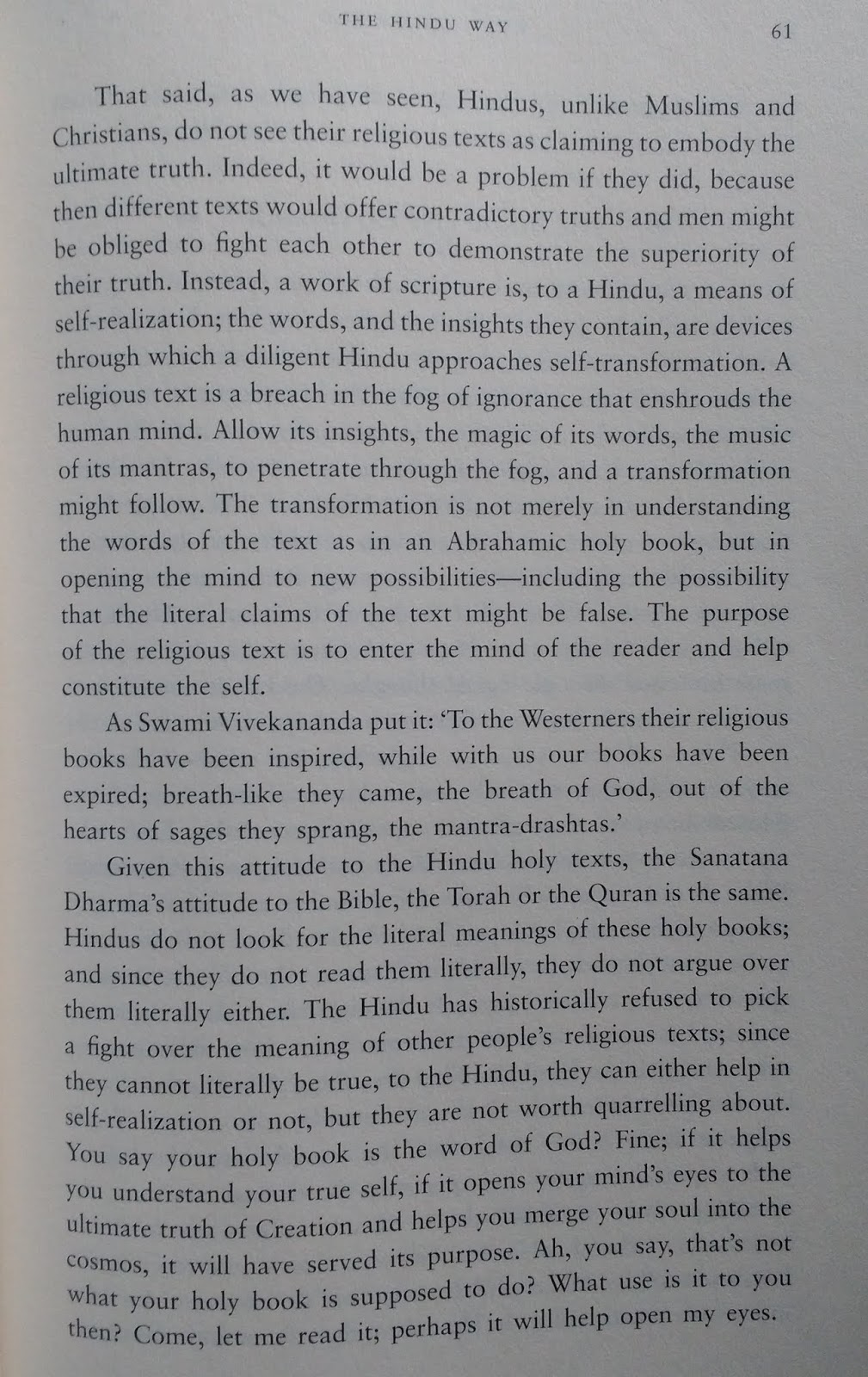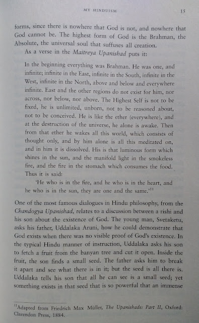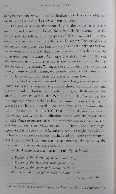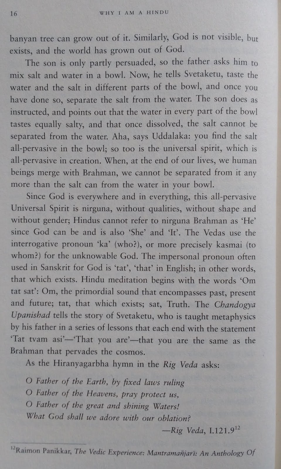 मग तो हिंदू आहे म्हणजे नक्की काय? किंवा इतर कुठलीही व्यक्ती स्वतःला हिंदू म्हणते म्हणजे काय? या प्रश्नावर प्रदीर्घ चिंतन सुरू होतं. हिंदू धर्माचा एकच एक प्रेषित नाही, संस्थापक नाही. हिंदू धर्माचा एकच एक सर्वमान्य ग्रंथ नाही की एकच एक देवता नाही. एकच एक उपासनापद्धती नाही. त्यामुळे हिंदू असणाची व्याख्या करणे कसं कठीण आहे हे लेखकाने सुस्पष्ट केलेलं आहे. हिंदु धर्माच्या प्रत्येक अंगाचा सविस्तरपणे आढावा घेतलेला आहे. हिंदूंमध्ये वेगवेगळ्या देवता आहेत पण तरीही हिंदू धर्मीय एकाच एक परमेश्वराला असे मानतात आणि त्या अर्थी ते एकेश्वरवादी कसे आहेत हे तथ्य विशद केलं आहे.