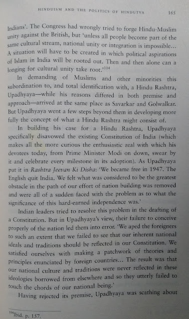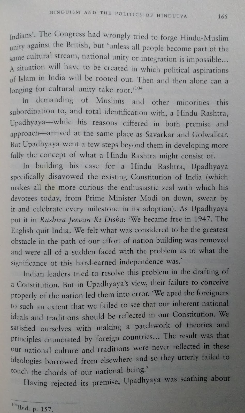 भारतीय जनता पक्ष ज्यांना अतिशय आदराचे स्थान देतो असे पंडित दीनदयाळ उपाध्याय यांनी जो “एकात्म मानववादाचा” सिद्धांत मांडला. त्यात ते खूप आदर्शवादी भूमिका घेतात कारण त्यावेळी जनसंघाला राजकीय स्थान नसल्यामुळे या कल्पना सत्यात उतरवण्याची जबाबदारी त्यांची नव्हती असं लेखकाचं मत पडतं. असा सिद्धांत मांडणारे उपाध्यायसुद्धा हिंद्वेतर लोकांनी हिंदू संस्कृतीशी, हिंदू जीवनपद्धतीशी स्वतःला जोडून घेतले पाहिजे, मिसळून घेतले पाहिजे, त्याप्रमाणे वागले पाहिजे असाच आग्रह करतात असे त्याचे निरीक्षण आहे.