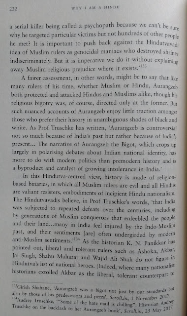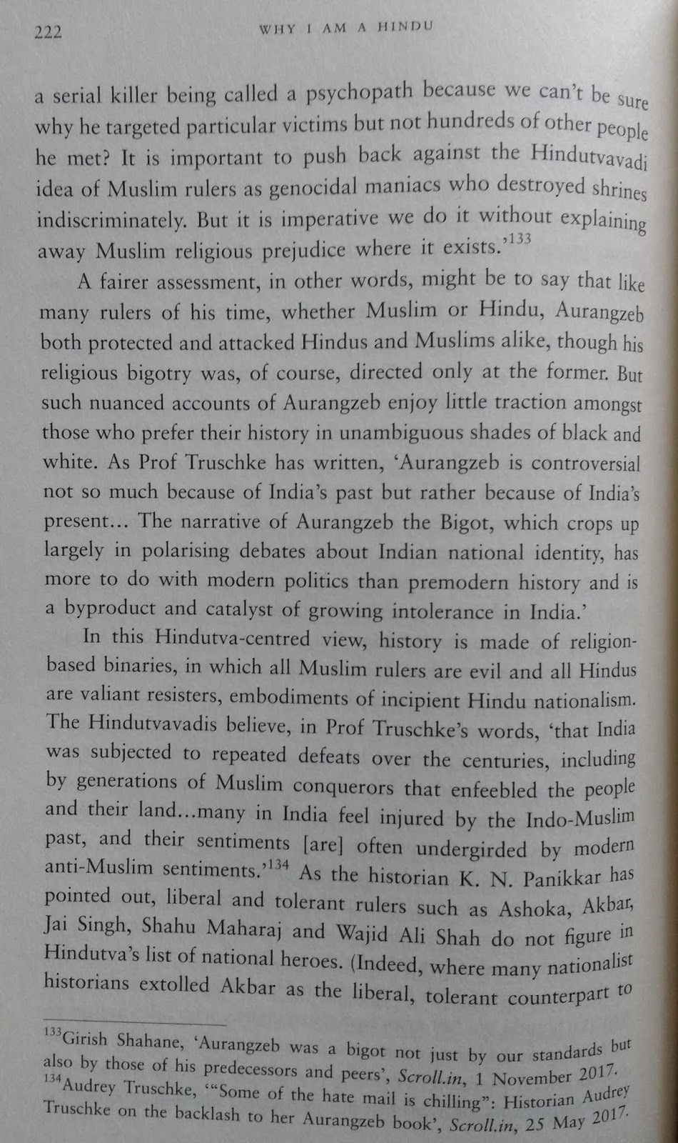 भारतावर मुसलमानी राजवट होती, ब्रिटिश राजवट होती हे खरे आणि त्यांनी अन्याय अत्याचार केले हे देखील खरे. बाबर बाहेरून भारतात आला पण पुढच्या सगळ्या पिढ्या इथेच जन्माला आल्या आणि मेल्या. इथल्याच झाल्या. त्यांनी लुटलूट केली असेल तरी इथेच खर्च केली. आधिच्या आक्रमकांप्रमाणे आणि ब्रिटिशांप्रमाणे ती मायदेशी नेली नाही. त्यामुळे मुघल राजवटीला भारतीय राजवटच समजलं पाहिजे. असा थरूर यांचा तर्क आहे. औरंगजेबाने “काही” देवळे पाडली असतील तर ती राजकारणासाठी. बाकी अनेक देवळांना त्याने मदत केली आणि अनेक देवळे शाबूत राहिली. सामुहिक धर्मांतर फार मोठ्या प्रमाणावर झालं नाही. बहुतांश देश हिंदूच राहिला असे त्याचे निरीक्षण आहे. हिंदुत्ववादी राजकारणी त्याचे खूप आक्रस्ताळेपणाने, अतिरंजित चित्र रंगवतात असं त्याचं म्हणणं आहे.