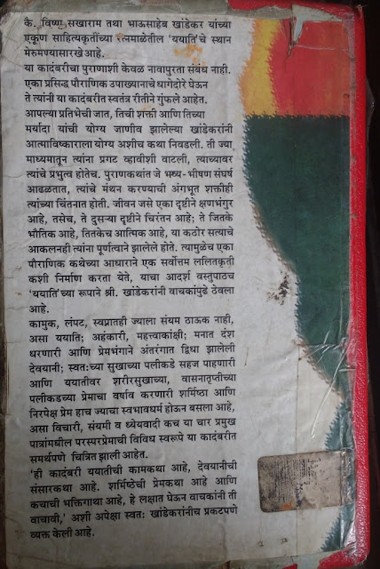 पुस्तकाच्या शेवटी खांडेकरांनी या कादंबरीची कल्पना त्यांना कशी मिळली, अनेक वर्षं त्यावर विचार, अभ्यास करून शेवटी प्रत्यक्ष लेखनाकडे ते कसे वळले, कथा पौराणिक असली तरी ति आजच्या जगातली प्रासंगिकता याबद्दल भाष्य केलं आहे.